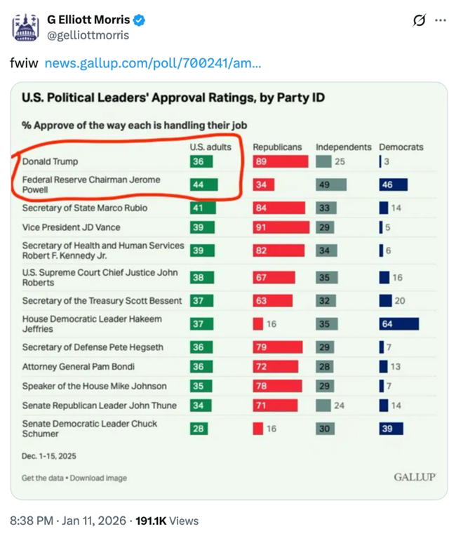 그러나 만약 이것이 사실이라면즉 시장이 오로지 거시경제의 기술적 요소만을 신경 쓰고연준 의장을 법적으로 압박하려는 노골적인 시도를 무시한다면이는 미국 엘리트 내부에서 정치적 응집력이 얼마나 무너졌는지를 더욱 분명히 보여준다제도는 중요하지 않다중요한 것은 오직 자금과 권력의 흐름뿐이다정치경제의 관점에서 보자면이는 순수한 허무주의의 순간이다.