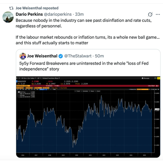 조 와이젠털(@TheStalwart) “5·5년 선도 인플레이션 기대(5y5y forward breakevens)는 이른바 연준 독립성 상실’ 이야기에는 전혀 관심이 없다.”