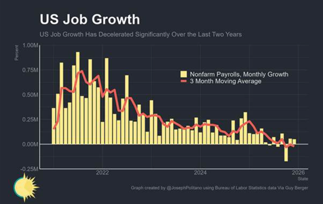 그러나 관세 인상에도 인플레이션이 가속되지 않을 가능성도 있다. 미국의 고용 시장은 이미 상당히 둔화했다. 2025년 전체 고용 증가 규모는 58만 4천 명에 그쳤으며, 월평균 증가폭은 4만 9천 명으로 2024년에 200만 명 증가에 비하면 4분의 1 수준에 불과하다. 실제로 2025년 하반기에는 신규 일자리 증가가 전혀 없었고, 실업률은 소폭 상승했다.
