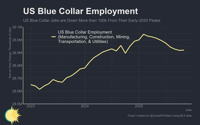 트럼프는 자신의 수입 관세가 해외에 있던 제조업 일자리를 미국으로 되돌려올 것이라고 자랑했다. 그러나 지난 1년 동안 미국의 산업 일자리는 6만 5천 개 감소했으며, 이는 2024년에 25만 개의 일자리가 늘어났던 것과 비교하면 극적인 반전이다. 올해에는 건설, 광업, 공공 유틸리티를 포함한 모든 블루칼라 부문에 큰 둔화가 닥쳤지만, 미국의 일자리 감소 대부분은 제조업과 운송업이 주도하고 있다.