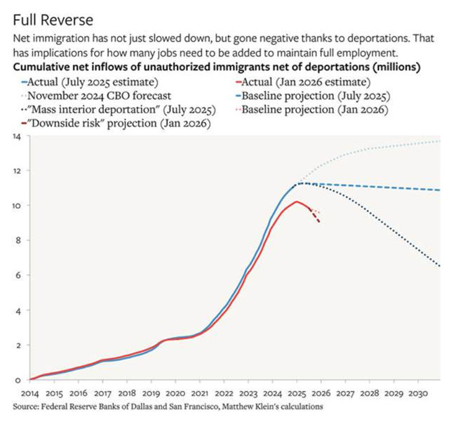 트럼프는 자신의 가혹한 비자 제한 정책과 미국 시민을 상대로 한 끔찍한 이민세관단속국(ICE)의 공격이 이 나라로 유입되는 이민의 흐름을 끝낼 것이라고 주장했다. 그리고 그는 옳았다. 2025년에 추방 조치로 미국 인구는 60~110만 명까지 감소했으며, 이는 바이든 집권 하에서 2022년과 2023년에 해마다 250만 명씩 인구가 증가했고 2024년에도 150만 명이 늘어났던 것과 대비된다.