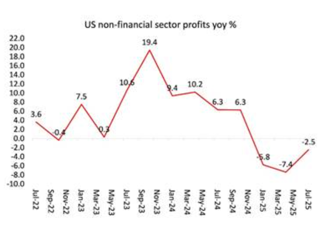 그렇다면 기업 이윤은 어떠한가. 이것이 투자를 늘리고 그 결과 경제 성장을 촉진할까. 기업 이윤 마진율, 즉 산출 단위당 이윤은 22.4%로 역사적으로 높은 수준 근처에 머물러 있다. 또한 2025년 3분기 기업 이윤은 상반기에 감소한 뒤 1천660억 달러 급증했다. 그러나 여기에서도 겉으로 보이는 수치는 오해를 낳는다. 3분기에 큰 폭으로 증가했음에도 비금융 기업 부문의 이윤은 지난해 같은 분기와 비교하면 여전히 2.5% 감소한 상태다.