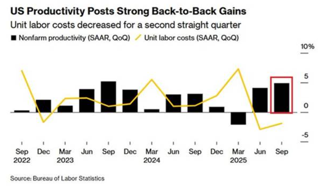 그렇다면 노동 생산성이 급격히 상승한다면 상황은 달라질까. 그렇게 되면 미국 기업들의 단위 노동비용이 낮아져 수입 가격 상승을 흡수하면서도 합리적인 수준의 이윤 증가를 유지할 수 있을까. 미국의 노동 생산성은 2025년 3분기에 연이율 기준 4.9% 상승했으며, 이는 지난 2년 동안 가장 강한 상승세다. 그 결과 단위 노동비용은 3분기에 1.9% 하락했으며, 이는 2분기에 이어진 감소로 2019년 이후 처음으로 두 분기 연속 하락이다. 그렇다면 인공지능 생산성 붐이 실제로 도래해 기업들이 새로운 노동자를 추가할 필요 없이도 실질적으로 성장할 수 있게 되면서, 2026년까지 미국 경제와 트럼프를 구해 줄 것일까.