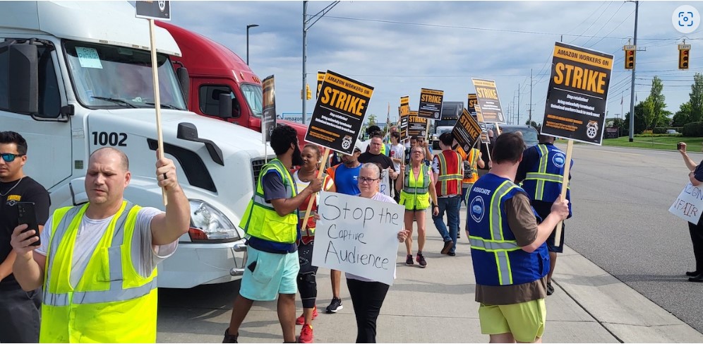 2023년 7아마존의 프라임데이 프로모션이 한창 진행 중이던 미시간주 폰티악의 배송 스테이션에서 100명의 창고 직원이 3시간 넘게 파업을 벌여 시설이 전면 폐쇄될 위기에 처했다사진: Zach Rioux
