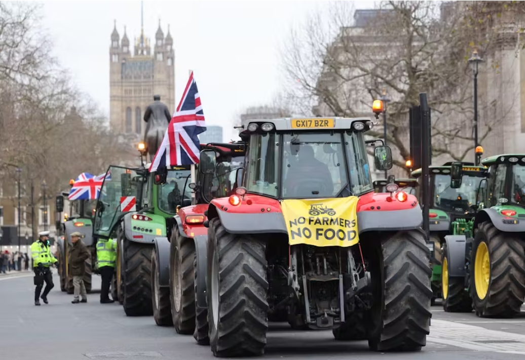 2024년 12월 11일, 런던 중심부의 화이트홀을 수백 대의 트랙터가 막고 있다. 출처: Matthew Chattle/Alamy