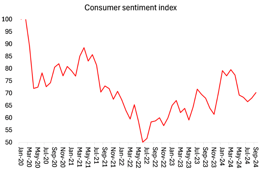 주류 경제학자들의 낙관적인 베이비부머 관점과 대부분의 미국인이 느끼는 ‘주관적’ 감정 사이의 이러한 괴리를 ‘바이브세션(vibecession)’이라고 부른다. 바이든이 취임했을 때와 비교해 미국 소비자들의 심리는 크게 떨어진 상태다.