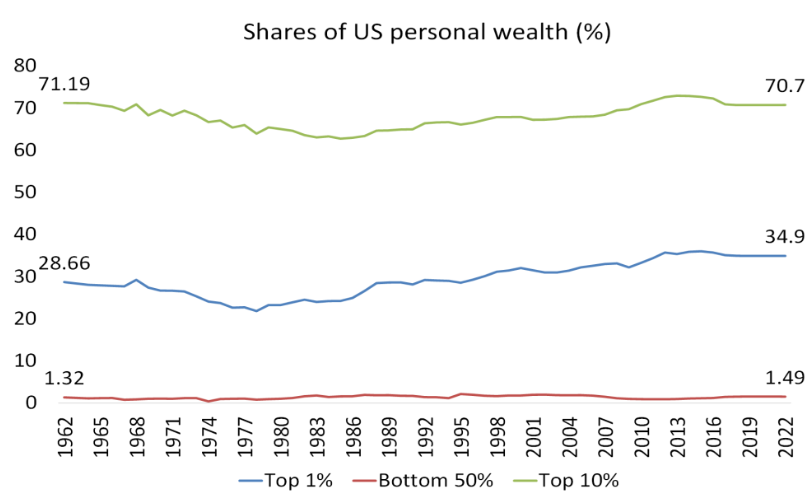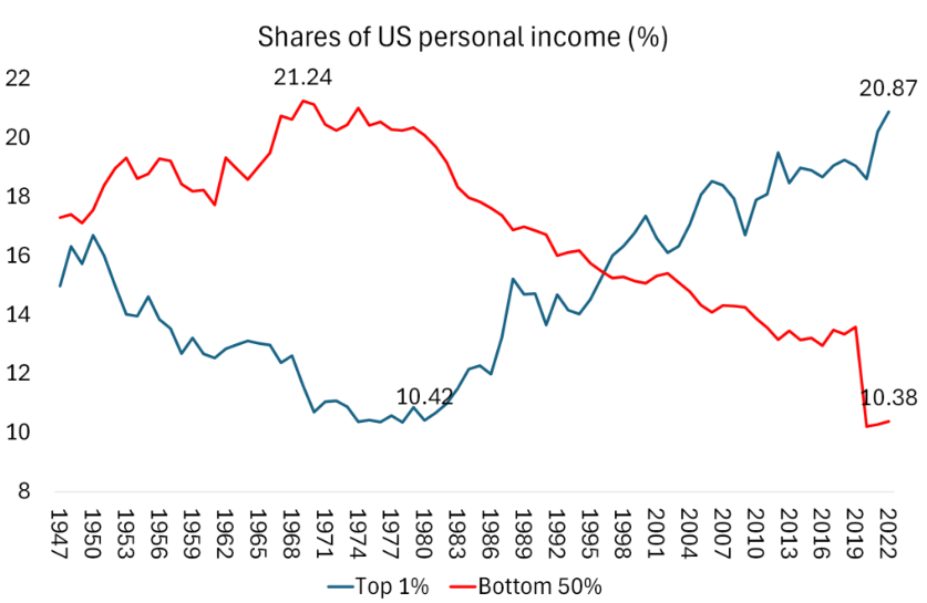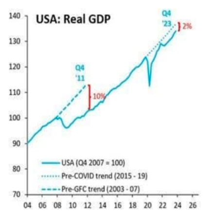 주류 경제학자들은 미국 경제가 유럽과 일본, 그리고 다른 주요 G7 자본주의 경제들보다 확실히 더 나은 성과를 내고 있다고 강조한다. 하지만 실질 GDP 성장률이 평균 2.5%라는 것은 1960년대나 1990년대, 혹은 2008년 금융 위기나 2020년 팬데믹 침체 이전과 비교했을 때 큰 성공이라고 보기 어렵다.