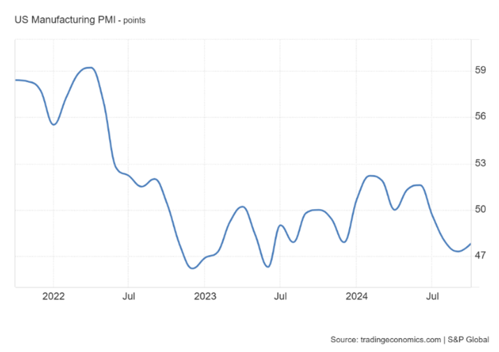 이른바 구매관리자 지수를 기반으로 미국 제조업 부문 경제 활동을 살펴보면, 미국 제조업이 11월 선거를 앞두고 4개월 연속으로 위축된 상태임을 보여준다(지수가 50 미만이면 위축을 의미한다).
