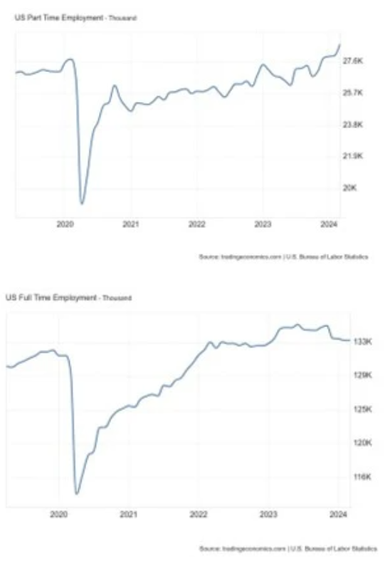 정부와 주류 언론은 낮은 미국 실업률을 강조하고 있다. 그러나 일자리 순증가의 상당 부분은 시간제 고용이나 연방 및 주 정부 서비스 부문에 집중되어 있다. 더 나은 임금과 경력 발전을 제공하는 주요 생산 부문의 정규직 고용은 부진한 상태다. 생활 수준을 유지하기 위해 두 번째 직업을 가져야 하는 노동자라면 경제에 대해 긍정적으로 느끼기 어려울 것이다. 실제로 부업을 갖는 사람들이 크게 늘어난 상황이다.