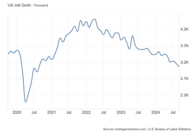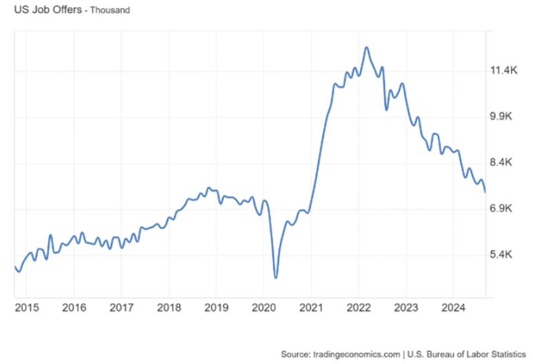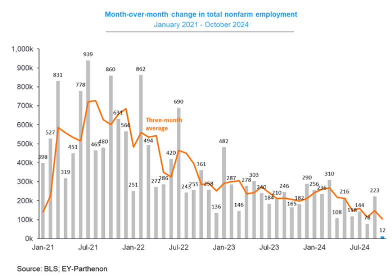 게다가 노동 시장도 점점 악화되는 추세다. 월별 순 일자리 증가 수치는 감소세를 보이고 있으며, 최근 10월 수치는 고작 12,000명 증가에 그쳤다. 이는 부분적으로 허리케인과 보잉 파업의 영향을 받은 결과다.