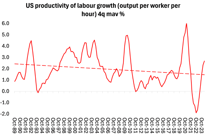 정부가 거대 하이테크 기업들에 막대한 보조금을 투입함으로써 생산성을 높이는 프로젝트에 대한 투자가 증가할 것이라는 것이 주류 경제계의 기대다. 특히 인공지능(AI)에 대한 대규모 투자가 결국 지속적인 생산성 성장의 도약을 가져올 것이라는 전망이다. 그러나 이러한 전망은 아직 불확실하고 의심스러운데, 이는 새로운 기술들이 미국 경제 전반에 확산되는 속도가 더딘 상황이기 때문이다.