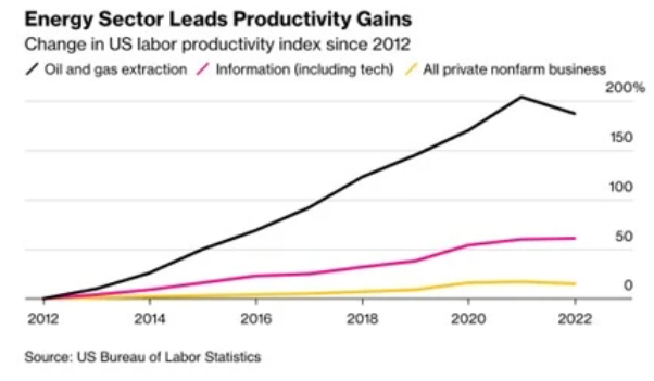 2010년 이후 미국의 석유와 가스 생산량은 거의 두 배로 증가했지만, 업스트림 부문의 고용은 감소했다. 즉, 이 부문에서의 생산성 향상은 고용 감소를 통해 이루어진 셈이다.