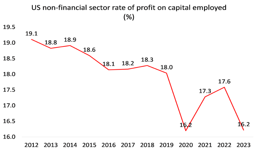 AI와 하이테크 부문에서 미국 기업이 자본 수익을 창출하지 못할 경우, 증가한 부채와 정부 보조금으로 조성된 거대한 투자 거품이 붕괴할 위험이 크다. 실제로, 하이테크 소셜 미디어 거대 기업들인 이른바 ‘매그니피센트 세븐’의 수익 급증을 제외하면, 미국 자본주의 생산 부문의 평균 수익성은 사상 최저 수준이다.