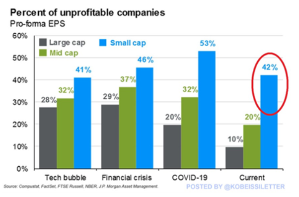 미국 소형주 기업의 약 42%가 수익을 내지 못하고 있는데, 이는 2020년 팬데믹 당시 53%의 소형주 기업이 적자를 기록한 이후 가장 높은 비율이다.