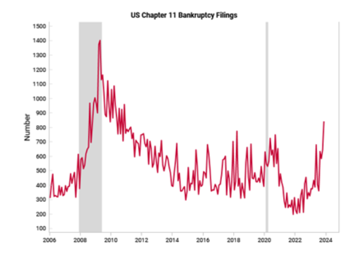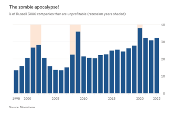 그리고 '좀비 기업'들도 잊어선 안 된다. 이들은 이미 이익으로 부채 상환 비용을 충당하지 못해 투자나 확장은 불가능하고, 그저 생존만 이어가는 상태다. 이런 기업들은 계속해서 대출을 받아 연명해왔고, 그 수는 점점 늘어났다. 따라서 높은 차입 금리에 특히 취약한 상황이다.