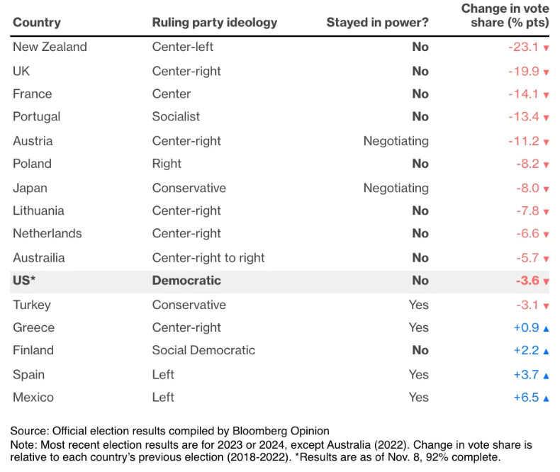 최근 눈에 띄는 승리를 거둔 유일한 집권당은 멕시코의 모레나다. 영국과 프랑스에서는 올해 집권당이 해리스가 겪은 패배보다 네 배나 더 심한 참패를 겪었다.