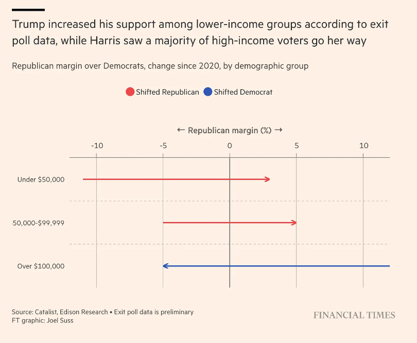 더 부유한 유권자들이 민주당으로 이동한 반면, 출구 조사에 따르면 연 소득 5만 달러 미만의 유권자들 사이에서 트럼프 지지로 약 15포인트의 변화가 나타났다. 반면, 연 소득 10만 달러 이상인 유권자들 사이에서는 민주당으로의 이동이 더욱 컸다.