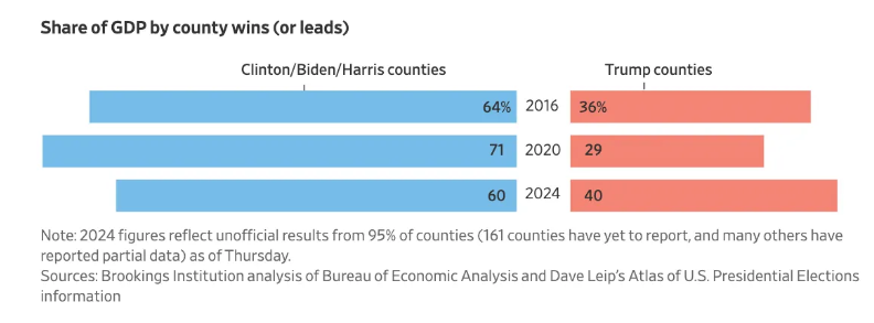 그 결과, 미국 경제에 맞춰 유권자 지도를 작성해 보면 민주당은 미국 GDP의 대부분을 생산하는 카운티에서 우세하다. 이는 2020년처럼 승리할 때나 2016년과 2024년처럼 패배할 때나 마찬가지다.