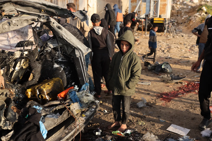 2025년 12월 13일, 가자시의 알라시드(Al-Rashid) 거리에서 이스라엘의 공습으로 파괴된 차량 잔해 옆에 한 소년이 서 있고, 다른 이들이 차량을 살펴보고 있다. 이번 공습으로 팔레스타인인 4명이 사망했다. 출처: Abood Abusalama/Getty Images