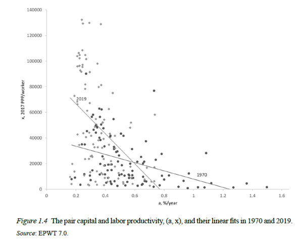 놀랍지 않게도 저자들은 자본-노동 비율과 노동 생산성이 양의 상관관계가 있다는 것을 발견했다. "자본-노동 비율이 낮은 국가의 경우, 이 변수들 사이에 오목한 관계가 존재한다. 또한 1970년과 2019년 사이에 북동쪽으로 이동하는 경향을 보여주는 추세선은, 국가들이 경제 성장 경로를 따라 자본-노동 비율과 노동 생산성을 높여왔음을 나타낸다."