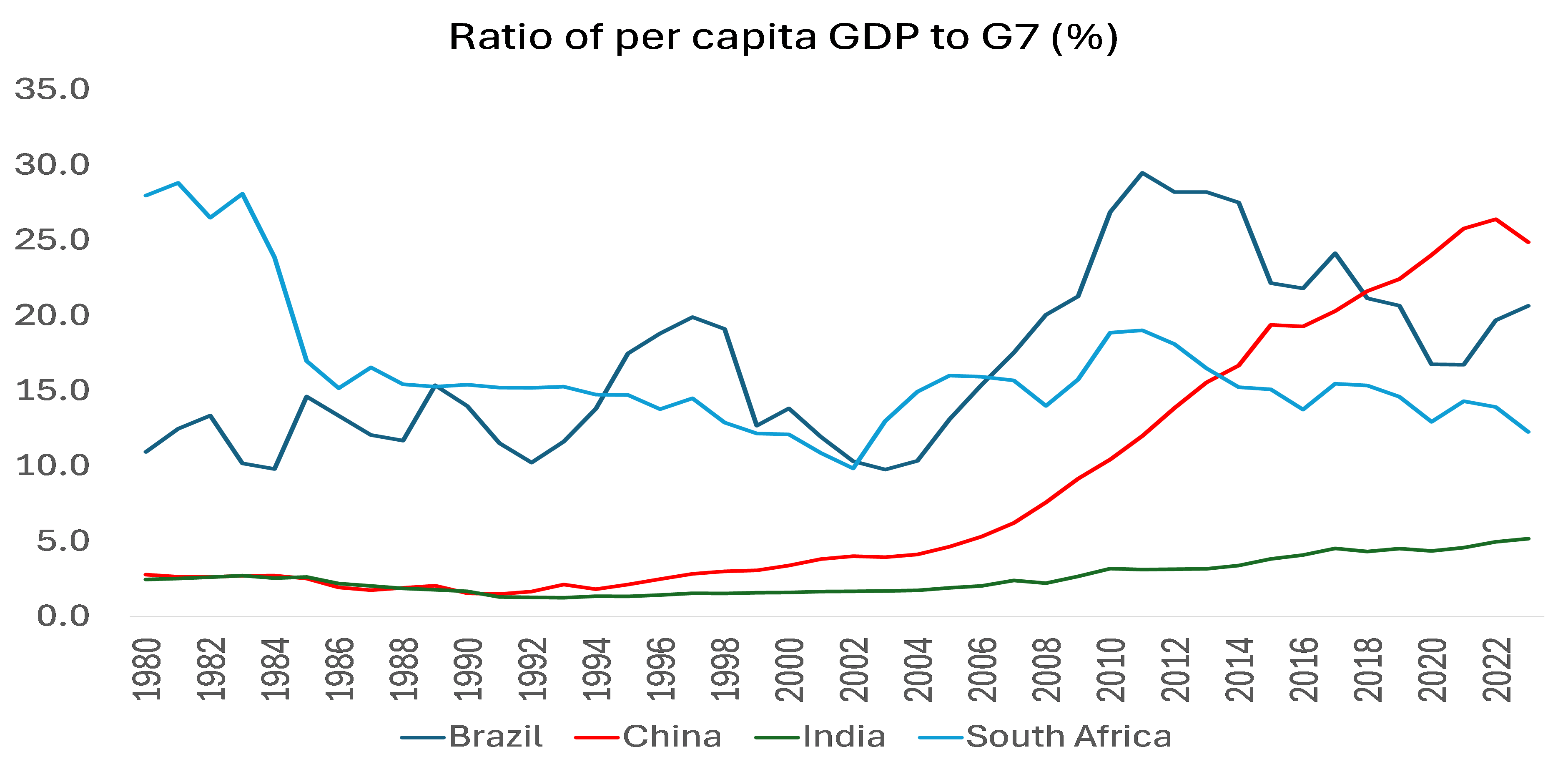 현실은 21세기에 거의 모든 '남반구' 국가와 인구에서 따라잡기가 일어나지 않고 있다는 것이다. 소위 BRICS를 예로 들어보면, 중국만이 제국주의 블록과의 1인당 GDP 격차를 좁히고 있다. 지난 40년 동안 남아프리카공화국은 더욱 뒤처졌으며, 브라질과 인도는 거의 진전을 이루지 못했다.
