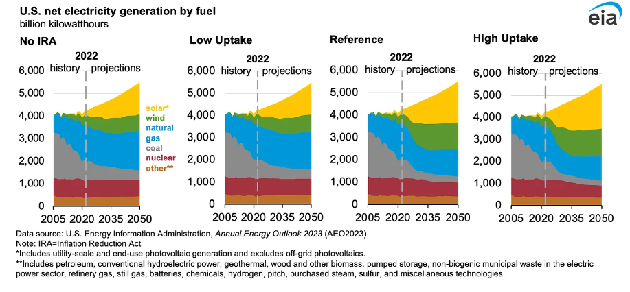 EIA(미국 에너지정보청) 전망은 전기 생성에 대한 흥미로운 다양한 시나리오를 제공한다. 전기 생성은 탈탄소화에 필수적인 경제 시스템의 일부이며, 상대적으로 탈탄소화가 가장 쉬운 부분이기도 하다. 풍력, 태양광, 배터리, 수력 및 원자력이 해결책이다.