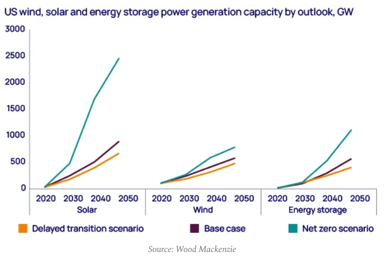 그러나 이 모델링에서도 보여주듯이, 현재 고려 중인 어떤 정책도 미국을 넷 제로로 이끌지 못한다. 2020년 이후 재생 에너지 투자의 속도가 빨라졌지만, 우드 맥켄지(Wood MacKenzie)의 시나리오에 따르면 넷 제로 경로에서는 태양광이 현재 미국에서 보이는 속도가 아닌 중국 수준으로 급증해야 한다.