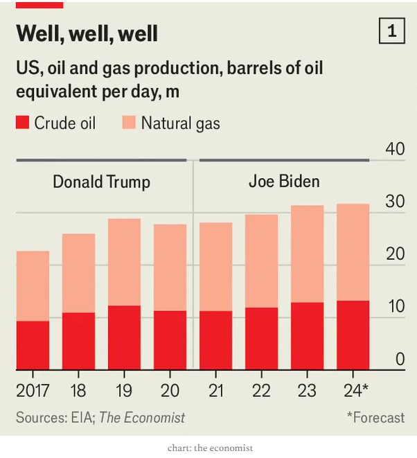 석유 산업이 공화당을 선호하고 규제와 허가에 대한 불만이 많음에도 불구하고, 바이든 행정부는 미국이 넷 제로를 달성하려면 필수적인 석유와 가스 생산 축소 문제를 제기조차 하지 않았다. 바이든 행정부는 트럼프 첫 3년과 다르지 않은 속도로 연방 시추 허가를 발급했으며, 미국 가스 공급을 러시아와 중국에 맞선 미국 주도의 동맹의 전략적 자산으로 추진했다.