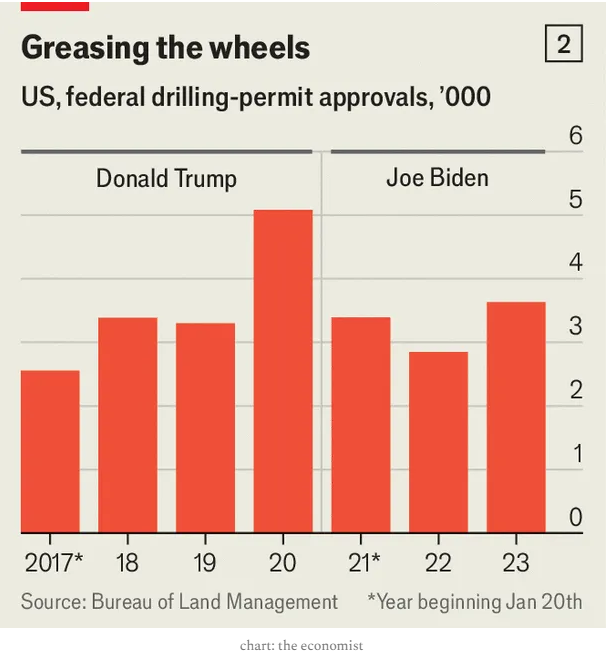 한 직설적인 석유 컨설턴트가 이코노미스트에 인정했듯이, 바이든 행정부나 트럼프 행정부 하에서도 미국에서 석유나 천연가스의 단기 생산을 실질적으로 억제하는 연방 정책은 없다. 지금까지 우리가 본 것은 그림자 싸움에 불과하다. 미국에서 석유와 가스 개발을 억제하려는 행정부의 정치가 어떻게 생겼는지 우리는 알지 못한다. 유가가 오르면 바이든 팀은 이를 다시 낮추려고 노력했다.