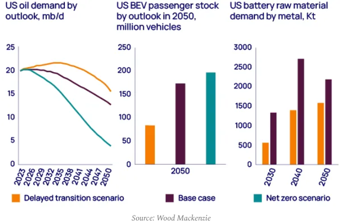 우드 맥켄지의 모델링에 따르면, 트럼프 행정부는 내연 기관 차량에서 하이브리드 차량으로의 전환을 선호할 것이지만, IRA가 지속되는 경로든 트럼프 경로든 미국의 석유 수요는 2030년대 중반 이전에는 거의 감소하지 않을 것이다.