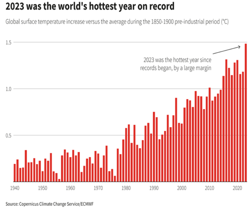 2023년에는 기록된 역사상 처음으로 지구 표면 온도가 1850~1900년 IPCC(기후 변화에 관한 정부 간 패널) 기준선보다 2.0°C 상승했다. 또한 전 세계 해양의 90% 이상이 폭염을 겪었고, 빙하는 기록상 가장 많은 얼음을 잃었으며 남극 해빙의 범위는 측정 사상 최저 수준으로 감소했다.