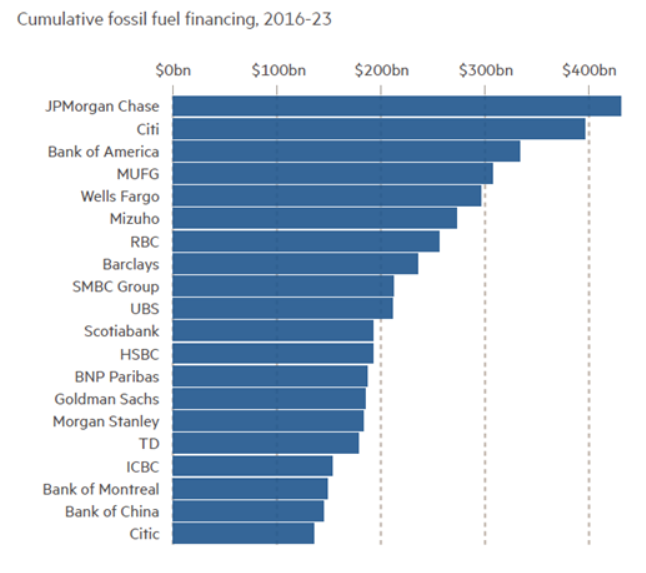 화석 연료 프로젝트의 주요 금융기관은 JP모건이라는 사실은 놀랍지 않다. 이 은행은 2021년과 2022년에 1,010억 달러의 화석 연료 거래를 인수한 반면, 710억 달러의 저탄소 거래는 인수하지 않았다. 기후 운동가들이 파리 기후 협약 이후 8년 동안 세계 최대 은행들이 화석 연료 산업에 총 6조 9천억 달러를 제공한 것으로 추산한 보고서에 따르면 JP모건 체이스, 미즈호, 뱅크 오브 아메리카는 작년에 가장 큰 화석 연료 산업 금융기관으로 선정되었다.