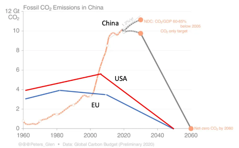 2000년대 중반 이후 중국의 막대한 배출량은 전 세계 기후 방정식에서 결정적인 역할을 하게 되었다. 물론 서구의 역사적 배출량은 불균형적으로 더 크다. 따라서 서방, 특히 미국이 지금보다 훨씬 더 많은 일을 해야 할 피할 수 없는 책임이 뒤따른다.