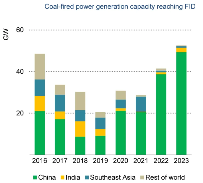 중국은 석탄에 대한 막대한 이해관계를 가지고 있으며, 전 세계적으로 중국은 석탄에 대한 유일한 신규 투자자다.