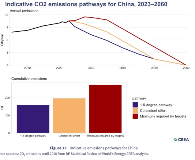 2060년까지 중립을 지키기 위해서는 중국이 언젠가 급격한 전환을 해야 한다는 사실을 피할 수 없는데, 문제는 언제, 어떤 조건으로 전환할 것인가이다. 중국이 1.5도 준수를 위해 2023년부터 2060년 사이에 급격한 노력을 기울인다면 누적 배출량은 160이 될 것이다. "일관된" 노력 경로에서는 누적 배출량이 200Gt, "최소 노력" 경로에서는 누적 배출량이 270Gt이 된다. 이 수치를 중국의 현재 배출량인 연간 11Gt과 비교하면 이 모든 궤적이 얼마나 까다로운지 알 수 있다.