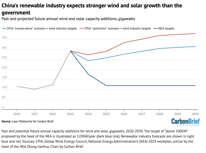 이 그래프의 컬러 선은 2022~2023년 급등 덕분에 도달한 새로운 수준에서 2060년 중립 목표를 달성하는 데 필요한 궤적에 대해 중국 태양광 및 풍력 부문 관계자들이 예측한 것이다. 필요한 것은 지속성과 앞으로 나아가는 것이지, 눈부신 가속화는 아니다. 중국의 에너지 전환은 이제 막 걸음마를 뗐다. 문제는 아래의 어두운 선이다. 이것은 국가에너지국(NEA)의 장젠화 국장이 최근 기고문에서 제시한 경로다. 장젠화는 청정 에너지 용량의 신규 추가를 연간 100GW로 유지해야 한다고 제안했는데, 이는 2023년에 달성한 수준의 절반에도 미치지 못하며 2060년까지 중립을 달성하는 데 필요한 속도보다 훨씬 낮은 수준이다. NEA의 2024년 작업 계획은 2023년 추가 용량이 300GW에 달했음에도 불구하고 비화석 발전 용량이 170GW 추가될 것으로 예상하는 등 비슷하게 낙관적인 전망을 내놓았다.