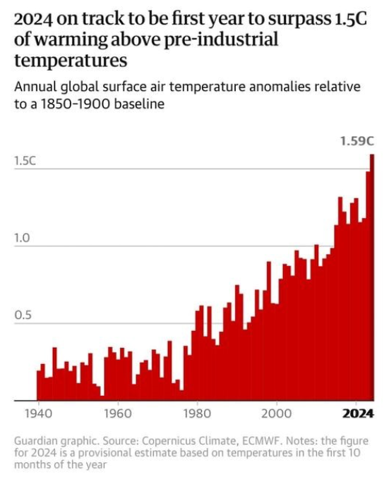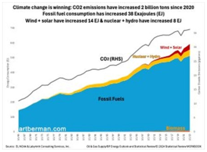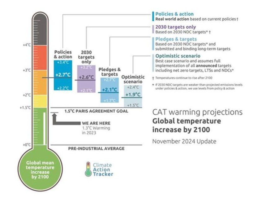 최신 데이터에 따르면 석탄, 석유, 가스에서 발생하는 지구 온난화 유발 배출량이 2024년에 0.8% 증가할 것으로 나타났다. 이에 비해, 세계가 COP 파리 협정에서 설정한 섭씨 1.5도 상승 목표를 달성할 가능성을 조금이라도 유지하려면 배출량이 2030년까지 43% 감소해야 한다. 그러나 그 목표는 이미 사망 선고를 받은 것이며, 지구는 산업화 이전 시기와 비교해 섭씨 2.0도(또는 그 이상) 상승을 향해 빠르게 나아가고 있다.