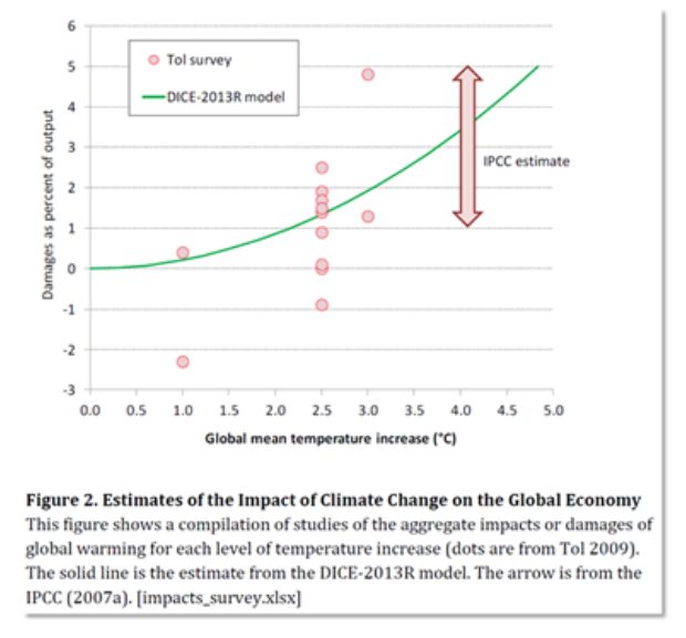 기후 변화로 인한 경제적 피해를 계산하는 데 사용되는 할인율은 자의적이다. 만약 3% 할인율을 사용한다면, 현재의 지구 온난화는 5조 달러의 경제적 손실(GDP 손실)을 초래할 것이지만, 현재 가치로는 4천억 달러에 불과하다. 이는 중국의 고속철도 투자 비용 정도다. 따라서 이 할인율로 보면 지구 온난화가 경제적 피해를 거의 일으키지 않으며, 결과적으로 탄소의 사회적 비용(SCC)은 톤당 약 10달러로 산출되고, 완화 조치는 제한될 수 있다. 노드하우스는 자신의 모델에서 이 값을 사용했다.