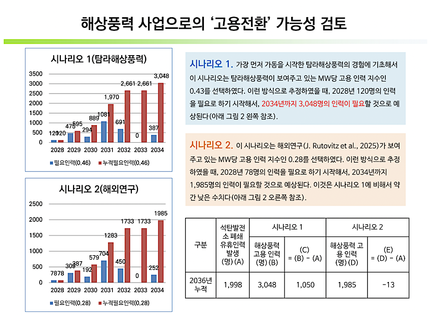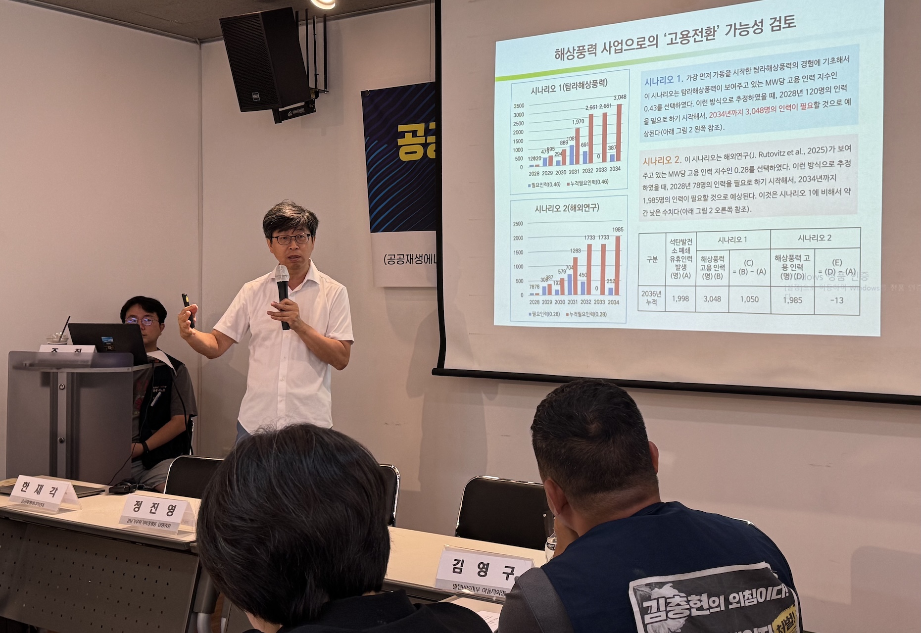 한재각 집행위원은 현재 발전공기업들이 계획하고 있는 해상풍력사업들의 필요 인력을 두 개의 시나리오로 산출한 결과, 석탄화력발전소 폐쇄로 인한 유휴인력 모두를 수용하고도 남는 규모이거나 전체 유휴 인력 중 상당 부분을 감당할 수 있다는 점을 짚고는, 이 같은 해상풍력의 고용전환 효과를 구현하기 위해서는, 이윤 중심의 민간 주도 해상풍력사업의 아니라, 발전소 폐쇄로 일자리를 잃게 될 노동자들의 고용 보장을 비롯한 정의로운 전환의 책임을 담보할 수 있는 공공재생에너지로서 해상풍력사업이 추진되어야 한다고 강조했다.