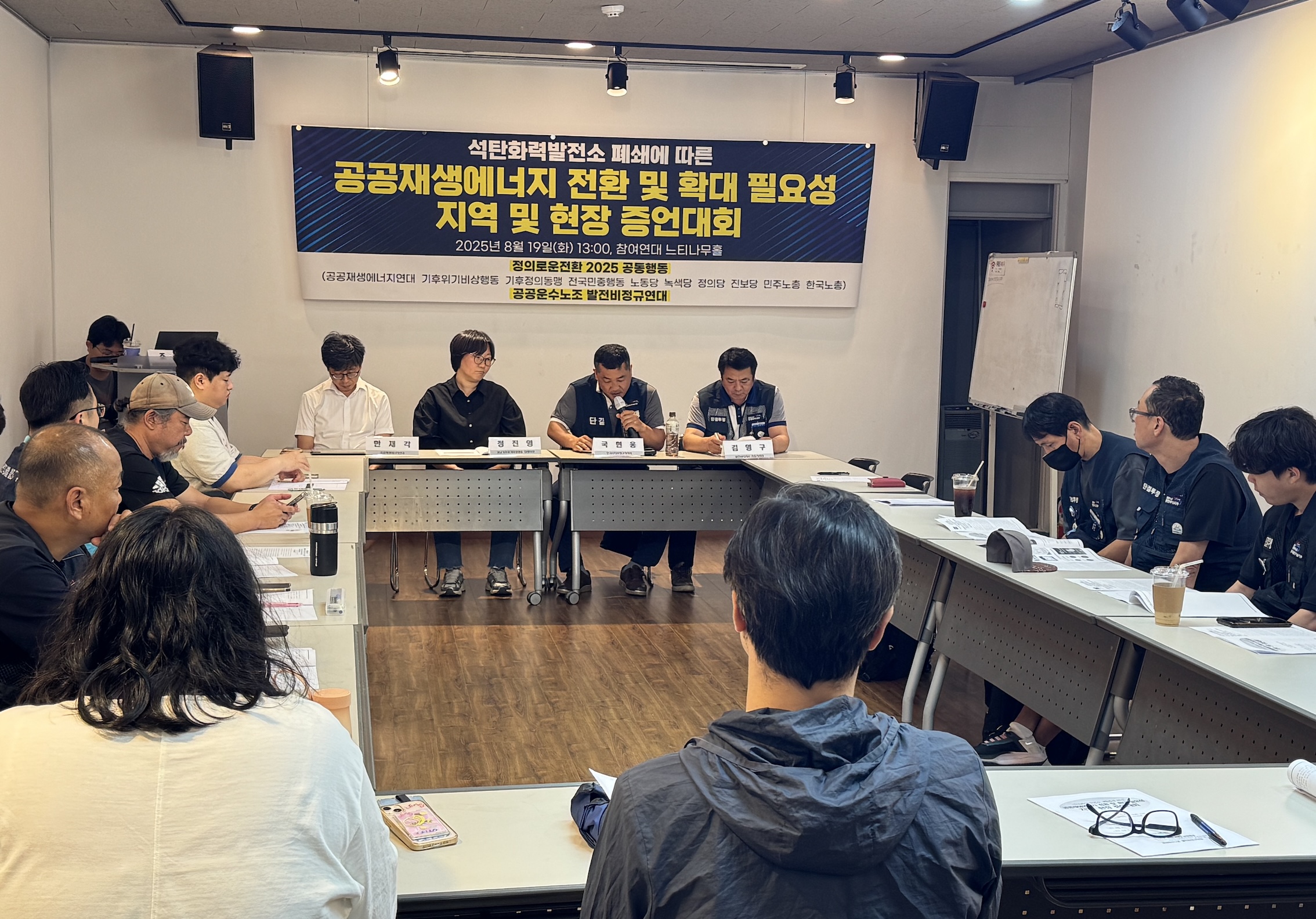 '정의로운 전환 2025 공동행동'과 민주노총 공공운수노조 발전비정규직연대는 19일 오후, 서울 종로구 참여연대 느티나무홀에서 “석탄화력발전소 폐쇄에 따른 공공재생에너지 전환 및 확대 필요성에 대한 지역 및 현장 증언대회”를 열고 발전소 폐쇄에 대한 현장 노동자와 지역 사회의 고민을 나누었다.