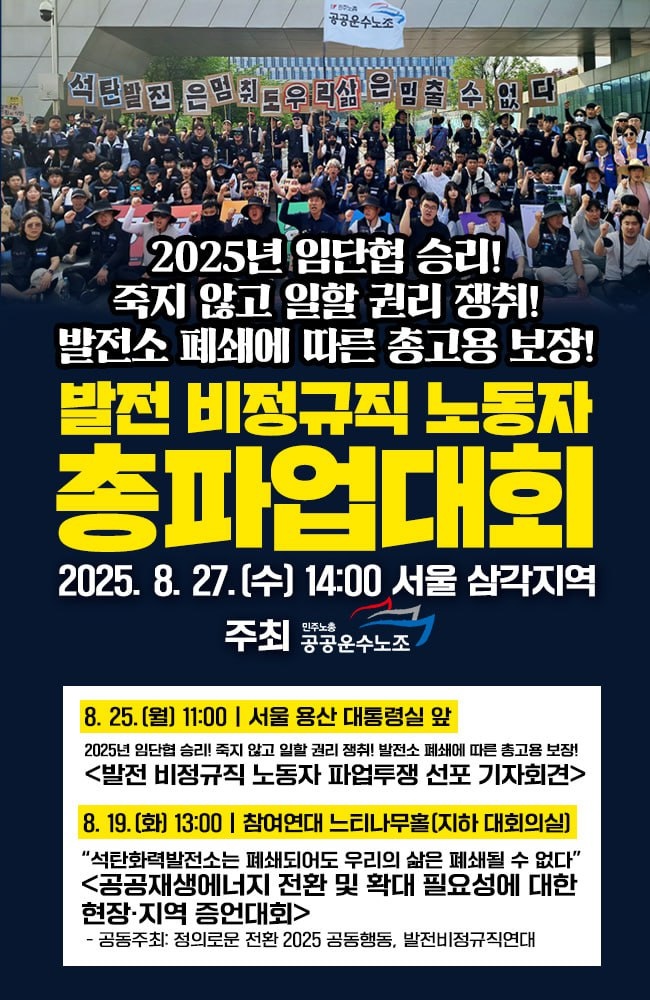 이에 발전 노동자들과 시민사회는 정의로운 전환을 위한 첫 걸음으로 공공재생에너지법 제정을 요구하면서 사회적 연대를 이어간다. 오는 27일에는 발전 비정규직 노동자들이 공공재생에너지 확대, 발전노동자 총 고용 보장 등을 요구하며 파업에 나선다. 이날 오후 2시 서울 삼각지역에서 열리는 총파업대회에는, 정의로운 전환을 위한 발전 비정규직 노동자들의 투쟁을 지지하는 전국 곳곳의 시민들이 서울로 함께 모일 예정이다.