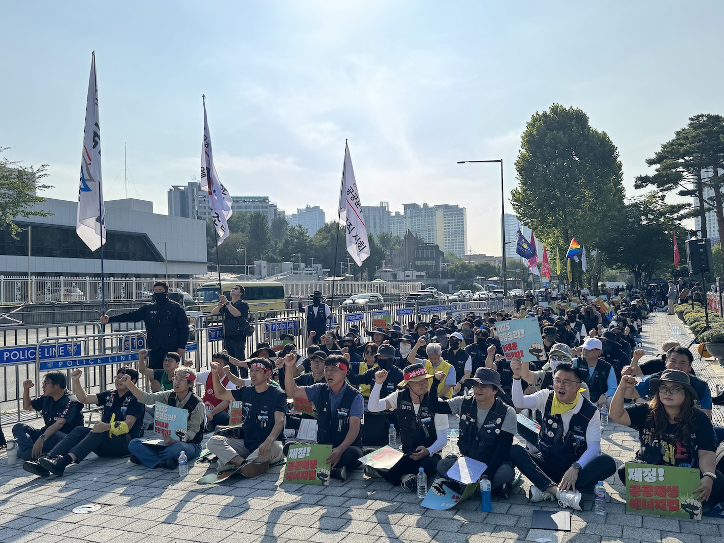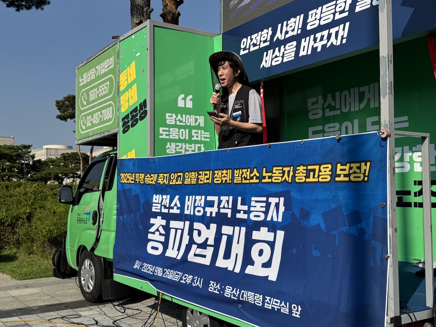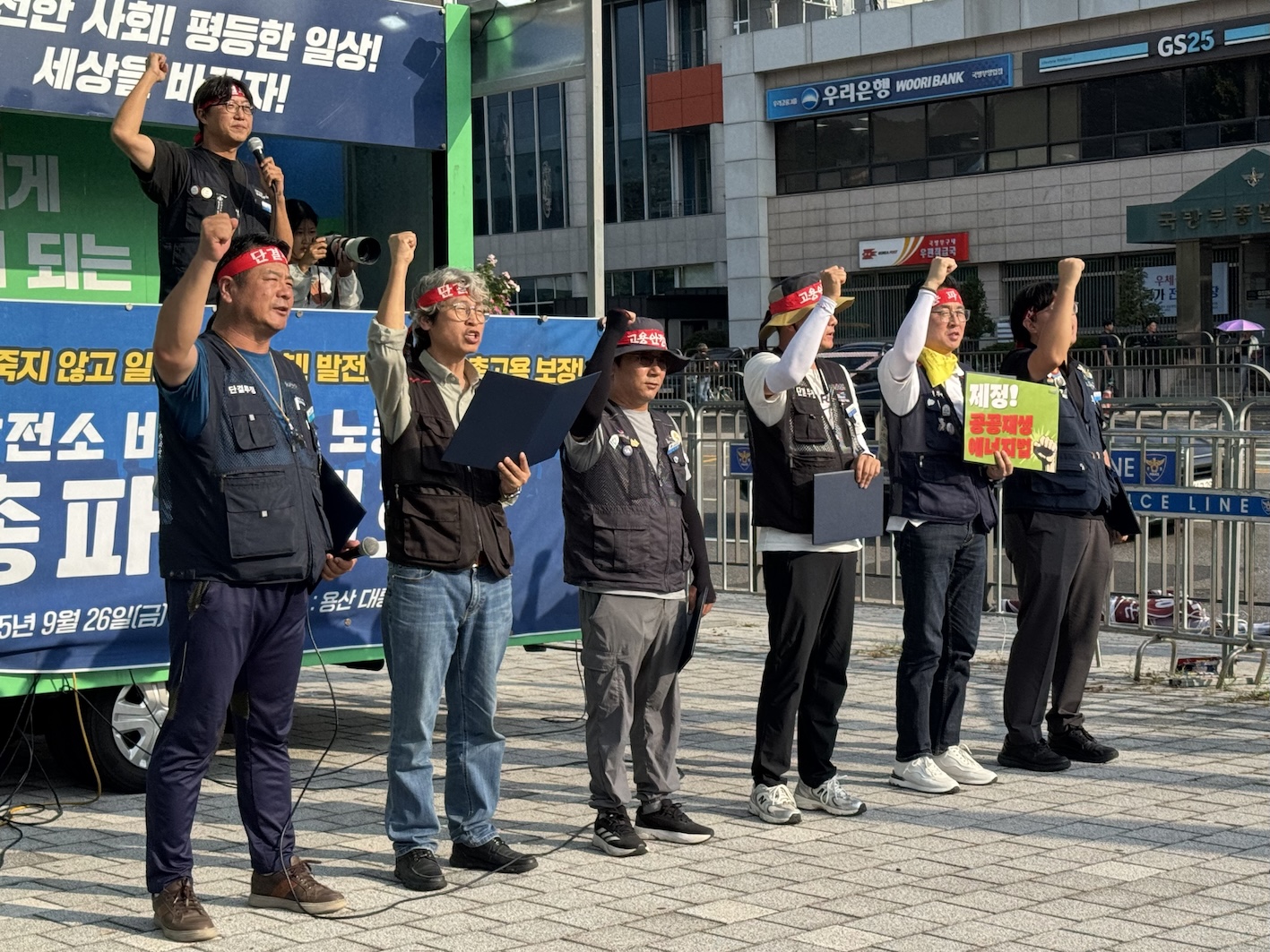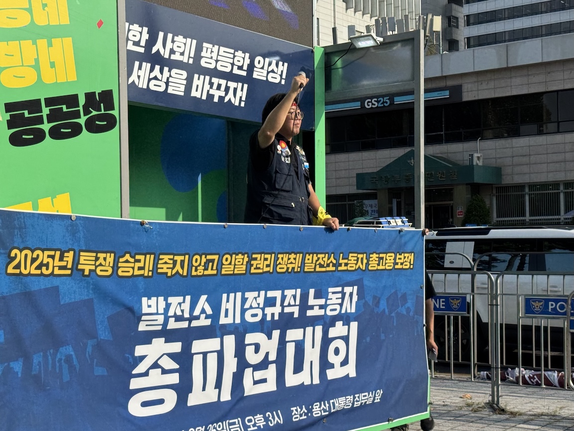 민주노총 공공운수노조 소속 발전 비정규직 노동자들은 26일 오후, 서울 용산 대통령 집무실 앞에서 총파업대회를 개최하고, 정부가 공공재생에너지법 제정과 발전 비정규직 당사자 노동자와의 노정교섭에 적극 나서 석탄화력발전소 폐쇄 국면에서 발전 노동자와 지역 주민의 일과 삶을 지킬 수 있는 실질적인 대책을 마련하라고 촉구했다. 공공운수노조 발전HPS지부와 한전KPS비정규직지회가 이날 ‘총파업투쟁’에 돌입했고, ‘금화PSC지부, 한전산업개발발전지부, 일진파워노조, 한국발전기술지부도 ‘총력투쟁’으로 결합했다. 총파업대회 현장에는 발전 비정규직 노동자들의 “정의로운 파업”을 지지하는 여러 노동자·시민들, 노동·시민사회단체들도 함께 자리를 지켰다.