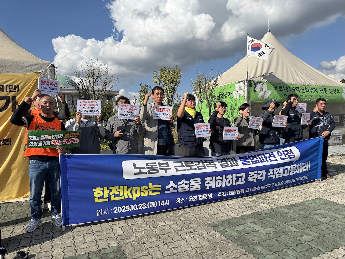 23일, 국회 앞, 태안화력발전소 근로감독 결과에 대한 고 김충현 대책위원회 입장 발표 기자회견 현장에서 "불법파견 노동부도 인정했다"는 피켓을 들고 있는 김영훈 민주노총 공공운수노조 한전KPS비정규직지회장(가운데). 참세상