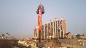 LG유플러스 비정규직 노동자 2명이 12일 오전 한강대교 북단 인근 40m 철탑 고공농성에 돌입했다. 이들은 철탑 꼭대기에서 ‘비정규직 끝장내자...