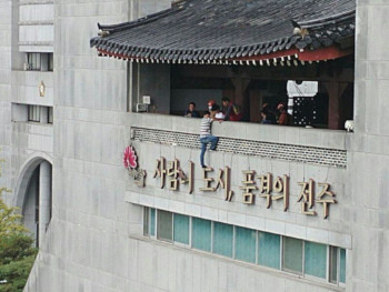 택시 노동자들이 31일 전주시청의 방해를 뚫고 시청 4층 기와지붕 아래를 점거했다.