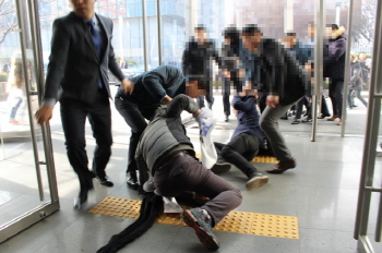 시민들이 강남 삼성전자 본관에서 기습 시위를 벌였다. 경비들은 철제 바리케이드로 시위 참가자들을 밀어내 위험한 상황을 초래했다.
