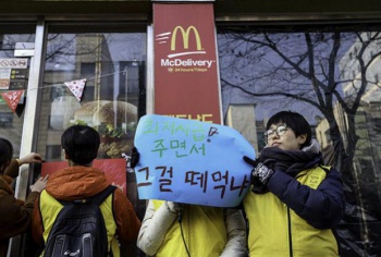 밀린 임금과 퇴직금을 요구하는 맥도날드 망원점 알바노동자들이 해당 매장을 찾아 임금체불을 촉구하는 퍼포먼스를 진행했다.