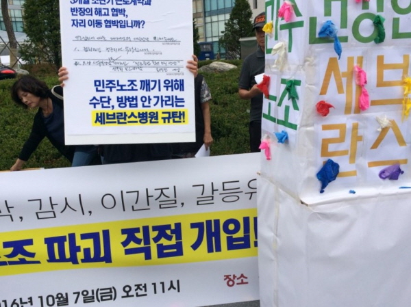 세브란스병원은 지난 9월 11일 청소 용역 계약을 맺은 태가비엠(주)에 업무일지 형태로 “민노(민주노총) 집회 예고, 철저 대응 바랍니다. 최*...