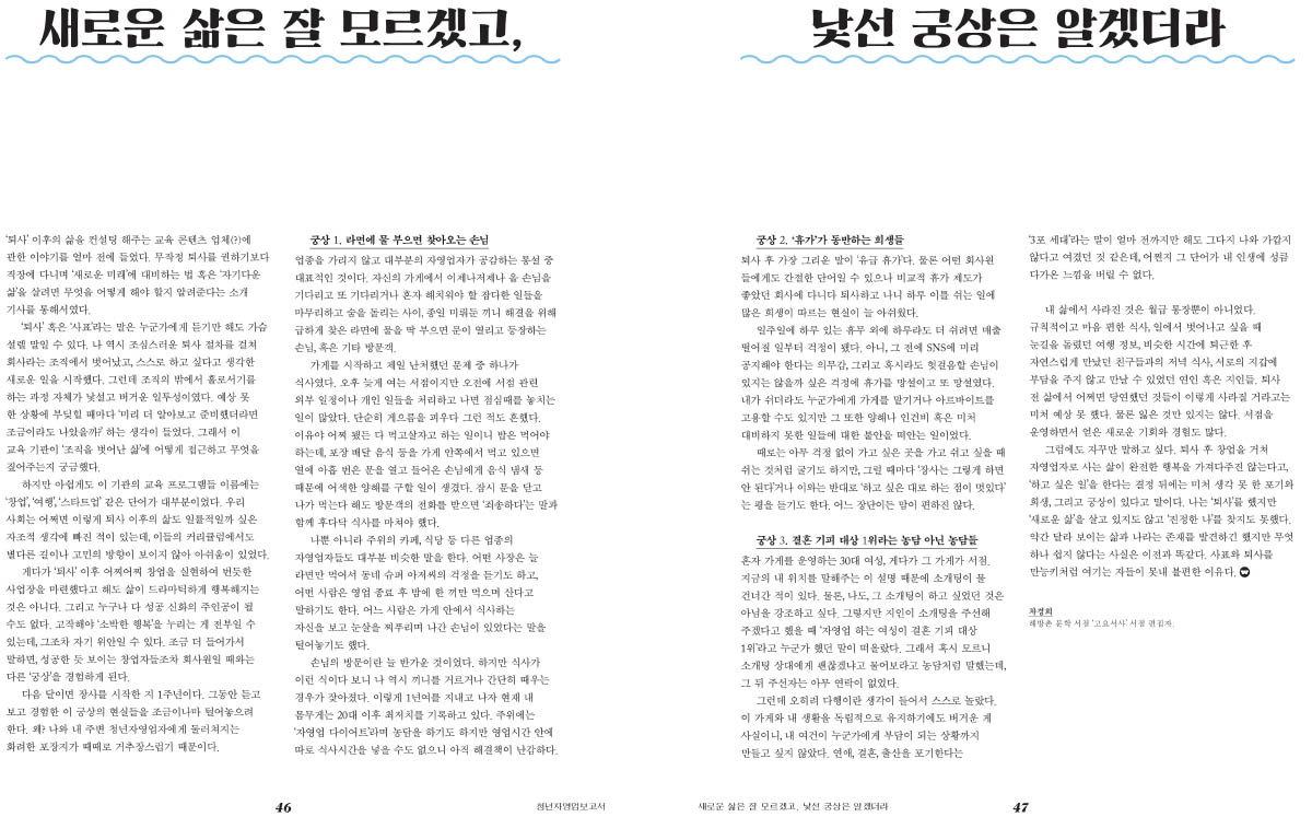 내 삶에서 사라진 것은 월급 통장뿐이 아니었다. 규칙적이고 마음 편한 식사, 일에서 벗어나고 싶을 때 눈길을 돌렸던 여행 정보, 비슷한 시간에 ...