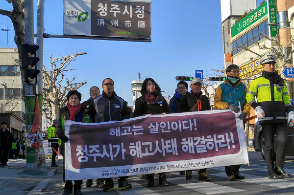 민주노총 충북본부는 11일 청주시청 앞에서 결의대회를 열고 청주시노인전문병원(노인병원) 새 운영자로 선정된 의명의료재단과 위수탁 체결을 중단하라...